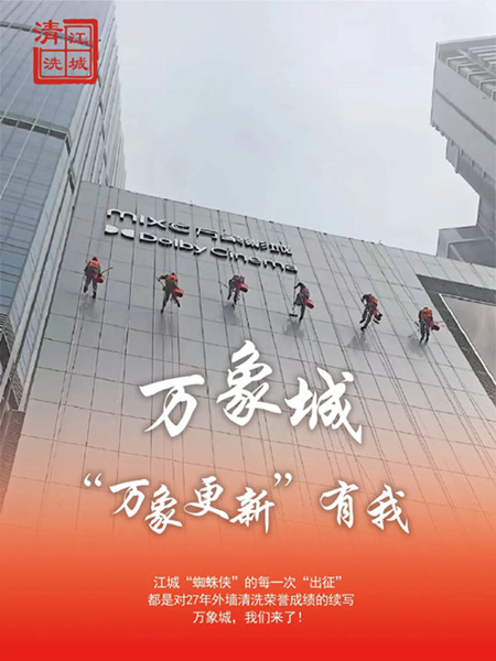 新的一年,萬象城將以嶄新面貌迎客。江城清洗工程隊期望它能匯聚更多歡樂。若您也想讓地標(biāo)建筑外墻潔凈如新,江城清洗工程隊?wèi){借其專業(yè)、專注、耐心的外墻清潔工,定是您的.佳選擇,助您共筑城市美麗風(fēng)景線。