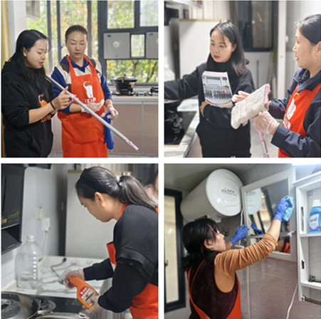 錢慧琴、蔣蘭蘭兩位講師則通過場景化教學,示范入戶溝通話術、演練精細擦窗流程、規(guī)范六區(qū)清潔操作,傳遞可直接復用的實戰(zhàn)經(jīng)驗。