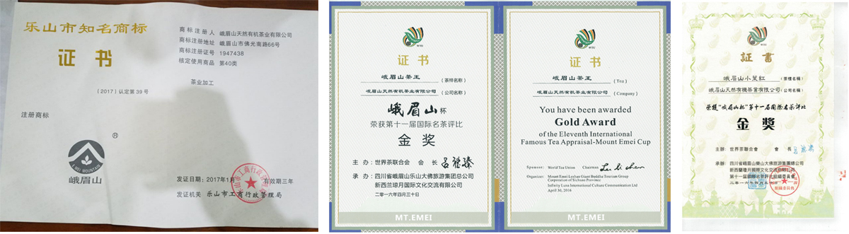 成為“四川省著名商標(biāo)” 四川國際秋季茶博會茶評比大賽金獎(jiǎng) “峨眉王茶王”峨眉山杯榮獲十一屆國際名茶評比金獎(jiǎng) “峨眉山小葉紅”榮獲峨眉山杯第十一屆國際亞太茶茗金獎(jiǎng)